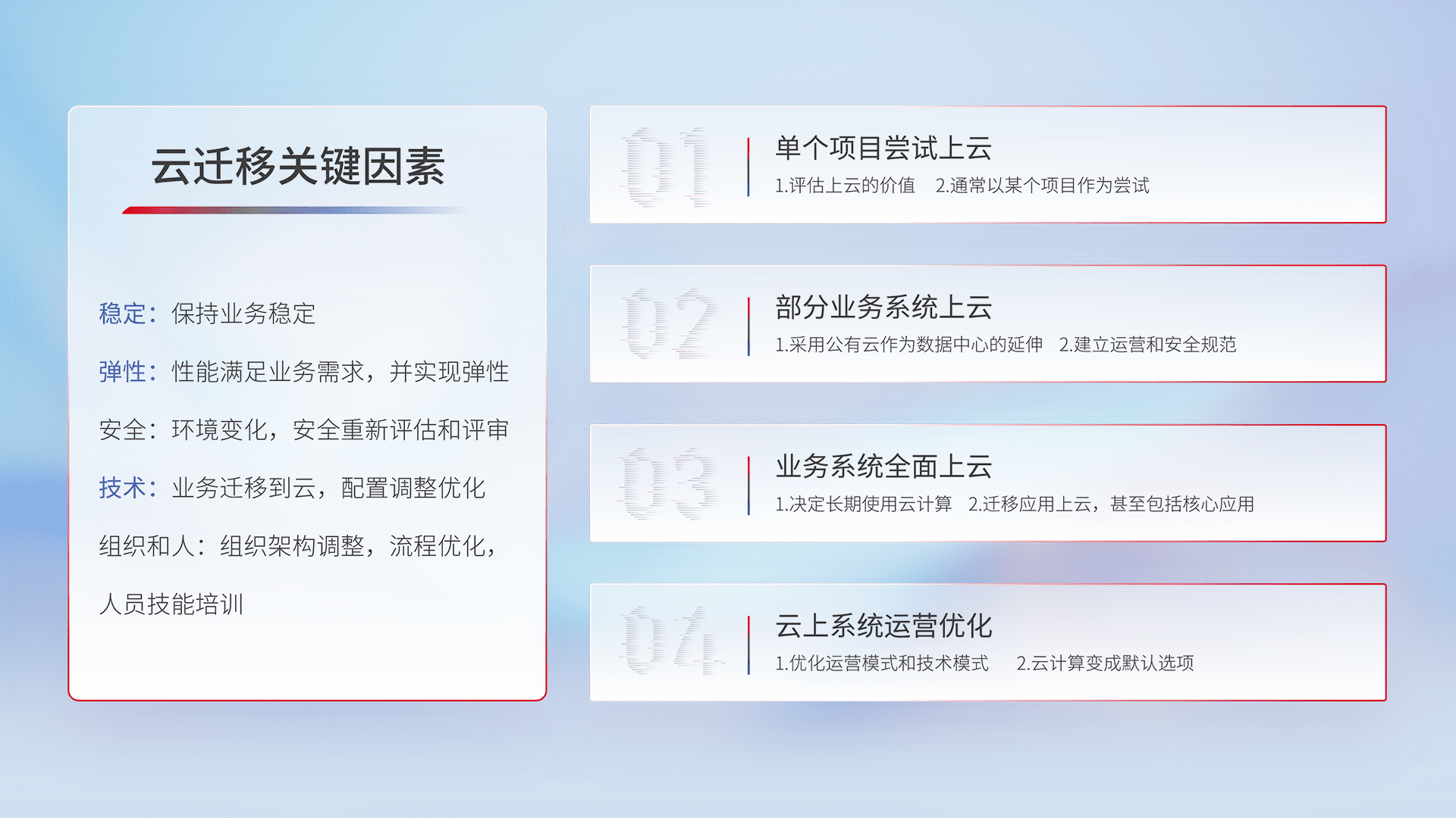 结合实际业务,,,从规划设计、、云平台选型、、云原生改造、、数据迁移、、、、集成交付,,迁移全过程为客户识别最佳上云路径,,,做好风险识别管理,,,,设计网络架构、、、、身份权限、、、安全审计合规、、操作审计、、、日志审计、、、监控告警策略、、、、多站点容灾设计等,,,,对云上基础设施进行整体规划,,提升IT治理水平,,以满足弹性、、高可用、、、、高性能的需求。。。